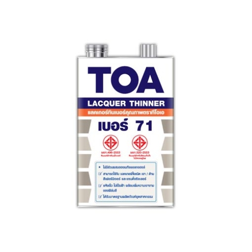 ทีโอเอ แล็กเกอร์ทินเนอร์ เบอร์ 71 ผลิตจากตัวทำละลายอินทรีย์แบบผสม ใช้เจือจางสีพ่นอุตสาหกรรม, สีพ่นรองพื้นชนิดแห้งเร็ว, ไนโตรเซลลูโลสแล็กเกอร์, แล็กเกอร์ แซนดิ้ง ซีลเลอร์ และสีพ่นรถยนต์เกรด NC ช่วยเพิ่มการยึดเกาะ ทำให้ฟิล์มเรียบ และมีความเงาสูง