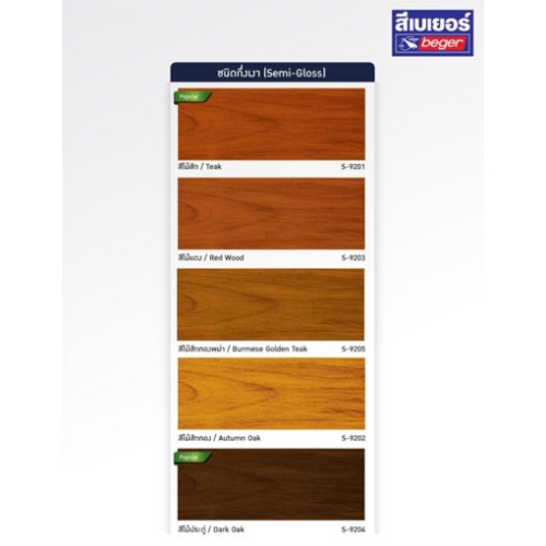 เฉดสี สีไม้สัก (G-9101) สีไม้มะฮอกกานี (G-9102) สีไม้วอลนัท (G-9103) สีไม้มะค่า (G-9104) และสีไม้แดงพม่า (G-9105)