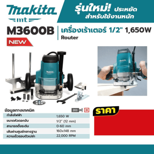 เครื่องเร้าเตอร์ไฟฟ้า มากีต้า (MAKITA) รุ่น M3600B ขนาดหัวจับดอก 1/2 นิ้ว (12 มม.) กำลังไฟที่ใช้ 1,650 วัตต์ ใช้สำหรับงานตัดไม้ และพลาสติก เหมาะสำหรับงานหนัก