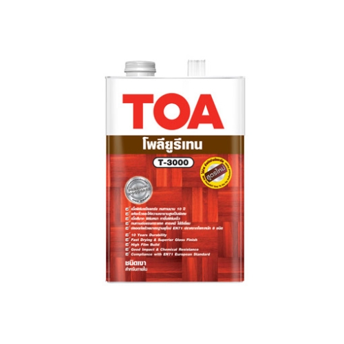 ทีโอเอ โพลียูรีเทน 1 ส่วน ชนิดเงา สำหรับภายใน T-3000 เป็นโพลียูรีเทนชนิดที่แห้งแข็งโดยทำปฏิกิริยากับความชื้นในอากาศ เหมาะสำหรับพื้นไม้ภายในที่ไม่มีแดดส่องถึง ทาง่าย ให้ความเงางามสูง ทนทานต่อการขูดขีด ทนทานต่อการขัดถู และทนต่อการกระแทกได้ดี ทนต่อกรด-ด่าง และสารเคมี ได้ดีเยี่ยม